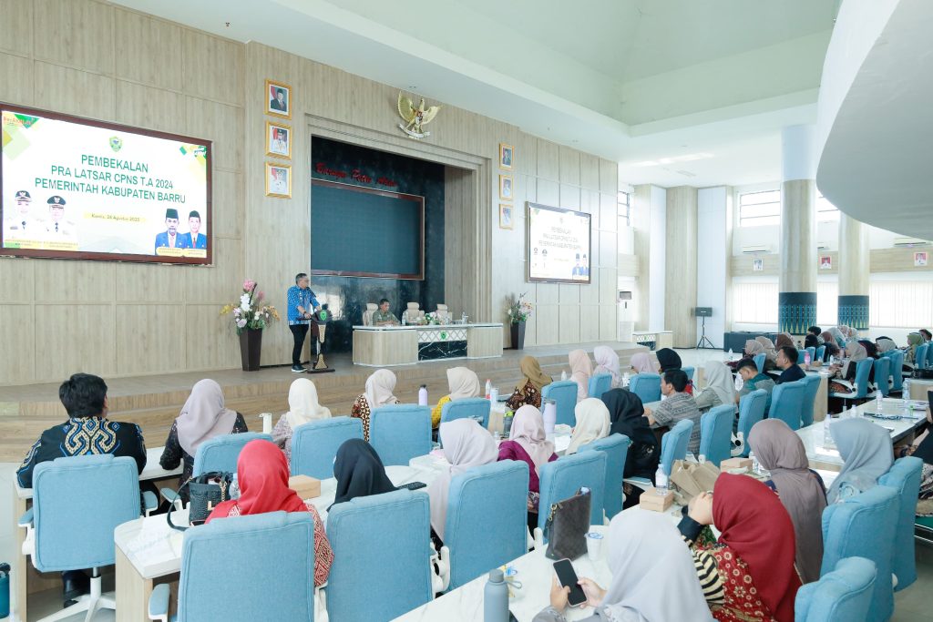 Green Leadership – Barru – Pemerintah Kabupaten Barru melalui Badan Kepegawaian dan Pengembangan Sumber Daya Manusia (BKPSDM) menyelenggarakan pembekalan pra Latihan Dasar (Latsar) bagi 152 Calon Pegawai Negeri Sipil (CPNS) Formasi Tahun 2025 di Lantai VI menara MPP Kantor Bupati Barru, Kamis 28/8/2025.
