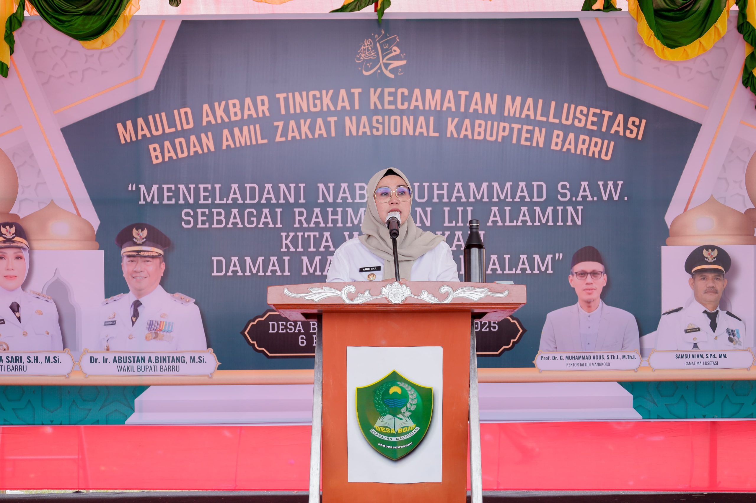 Green Leadership. id – Barru – Bupati Barru, Andi Ina Kartika Sari, S.H., M.Si., menghadiri Peringatan Maulid Akbar Tingkat Kecamatan Mallusetasi yang digelar oleh Badan Amil Zakat Nasional (BAZNAS) Kabupaten Barru di Lapangan Sepakbola Tunas Muda, Desa Bojo, Senin (29/9/2025) sore.