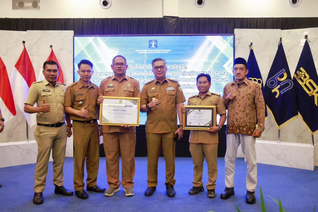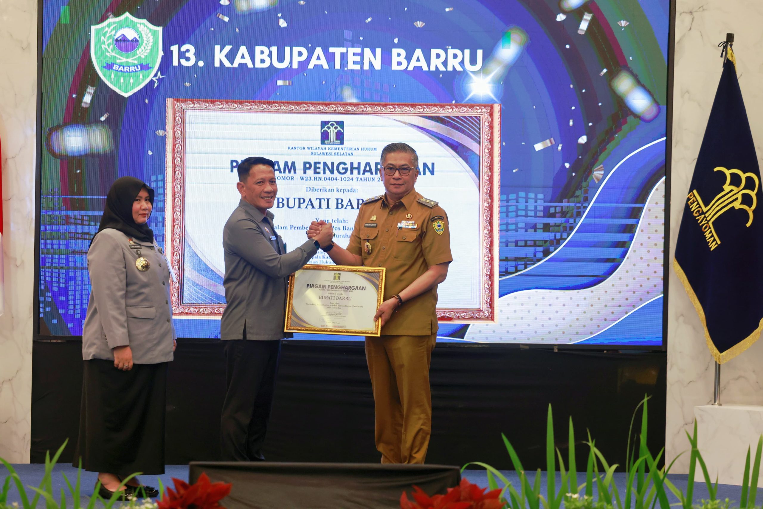 Diketahui, Kanwil Kemenkum mengapresiasi langsung dengan Piagam Penghargaan kepada Pemerintah Kabupaten Barru dan 7 Pemerintah Kabupaten/Kota lainnya se-Sulsel.