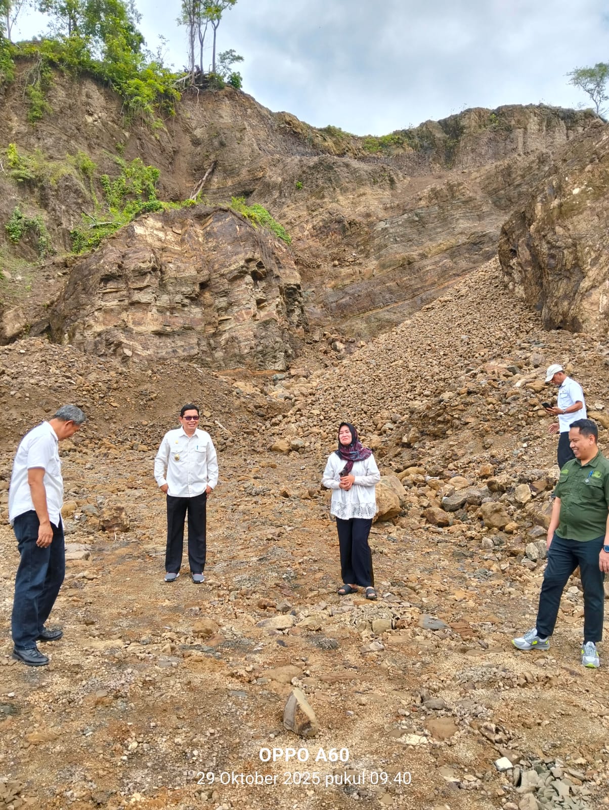 Didampingi tim teknis, Kadis LH menapaki area bekas galian tambang yang tampak terjal dengan tumpukan material batuan di kaki tebing. Cuaca yang teduh tak mengurangi keseriusan tim menelusuri setiap sudut lokasi untuk memastikan kondisi faktual di lapangan.