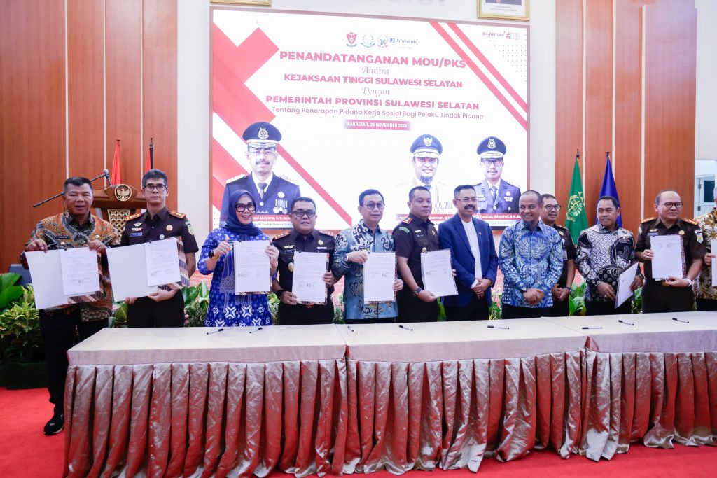 Penandatanganan MoU/PKS yang turut disaksikan Jaksa Agung Muda Tindak Pidana Umum (Jampidum) Kejagung, Prof. Dr. Asep Nana Mulyana, S.H. M. Hum. Gubernur Sulsel Andi Sudirman Sulaiman, Kajati Sulsel Dr. Didik Farkhan Alisyahdi, berlangsung di Aula Asta Cita Rujab Gubernur Sulsek di Makassar, Kamis 20/11/2025.