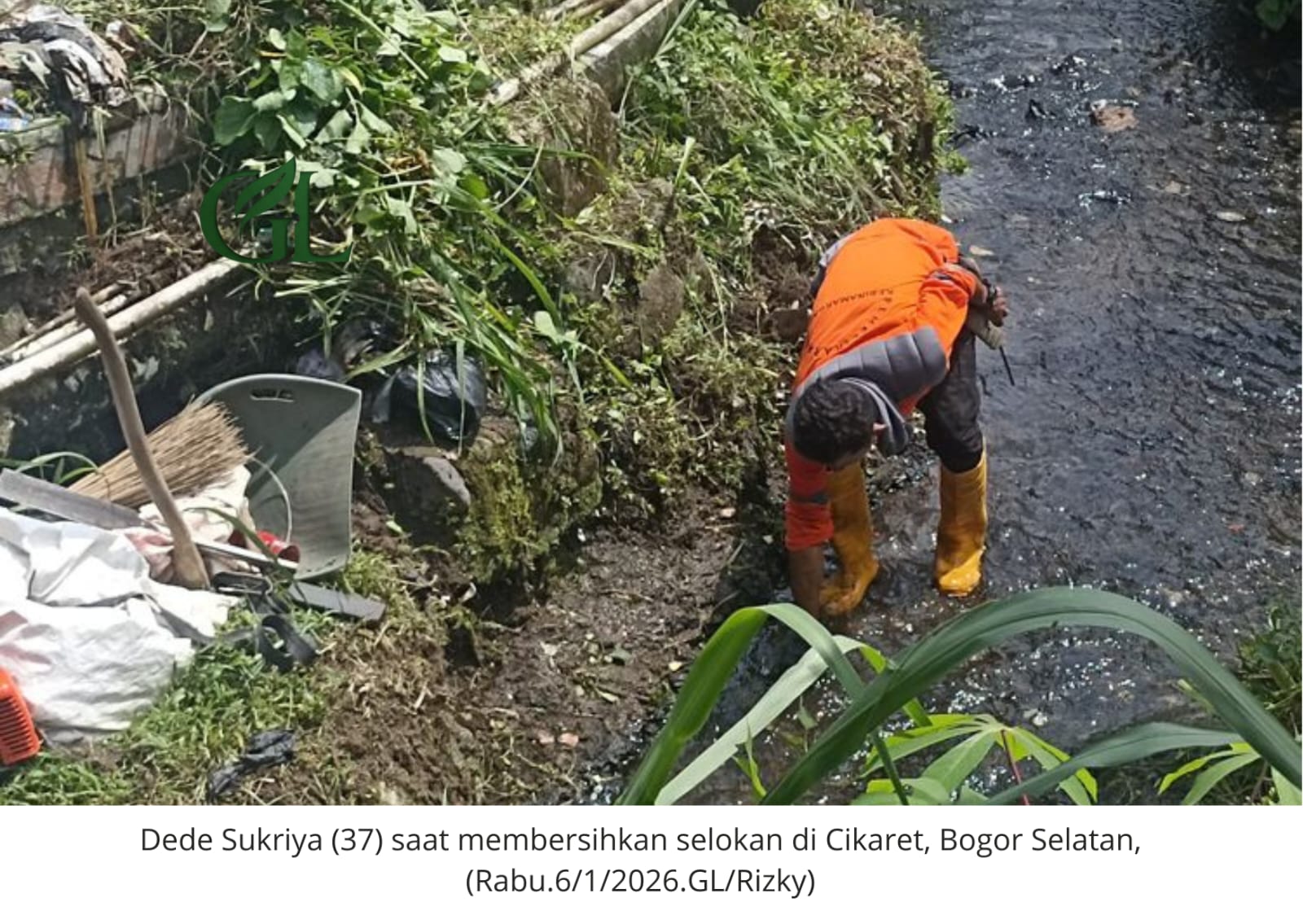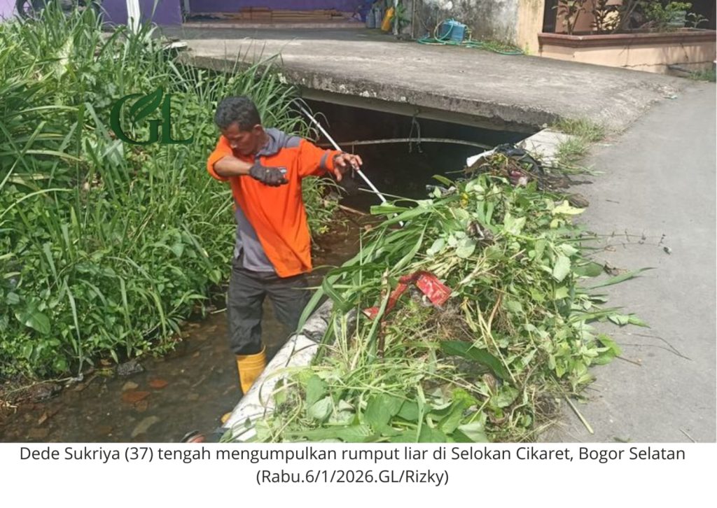 GREENLEADERSHIP – Bogor – Di bawah terik matahari Cikaret, Bogor Selatan, seorang pria dengan kaus oranye dan bot karet kuning tampak kontras di antara tumpukan sampah. Tangannya yang menggenggam golok tak berhenti mengais lumpur, mengangkat plastik, popok bayi, hingga limbah rumah tangga yang menyumbat aliran air.